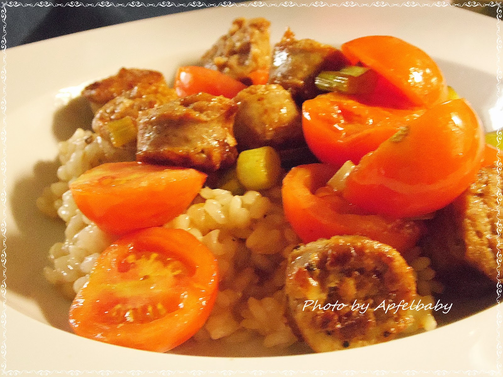 Dazu gebt ihr nun die Cocktailtomaten und Frühlingszwiebeln dazu und lasst das kurz mit braten.
